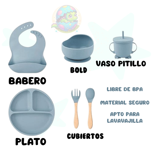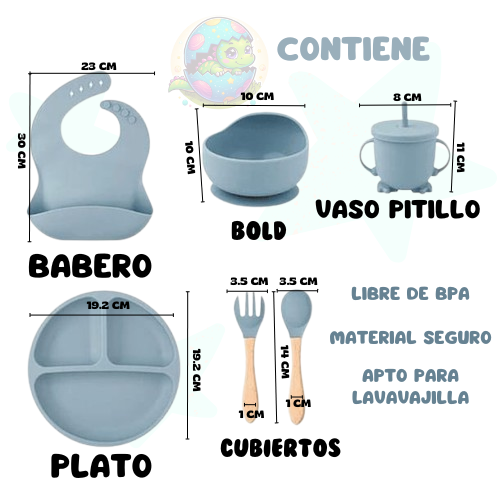 1 babero,1 Plato con tres divisiones,1 Plato hondo,1 Vaso,1 Tapa pitillo para el vaso,1 Tenedor,1Cuchara.