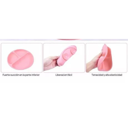 El plato con divisiones y el plato hondo cuentan con ventosa de succión para adherirlo al vidrio de la mesa o a cualquier superficie plana y lisa para evitar derrames accidentales